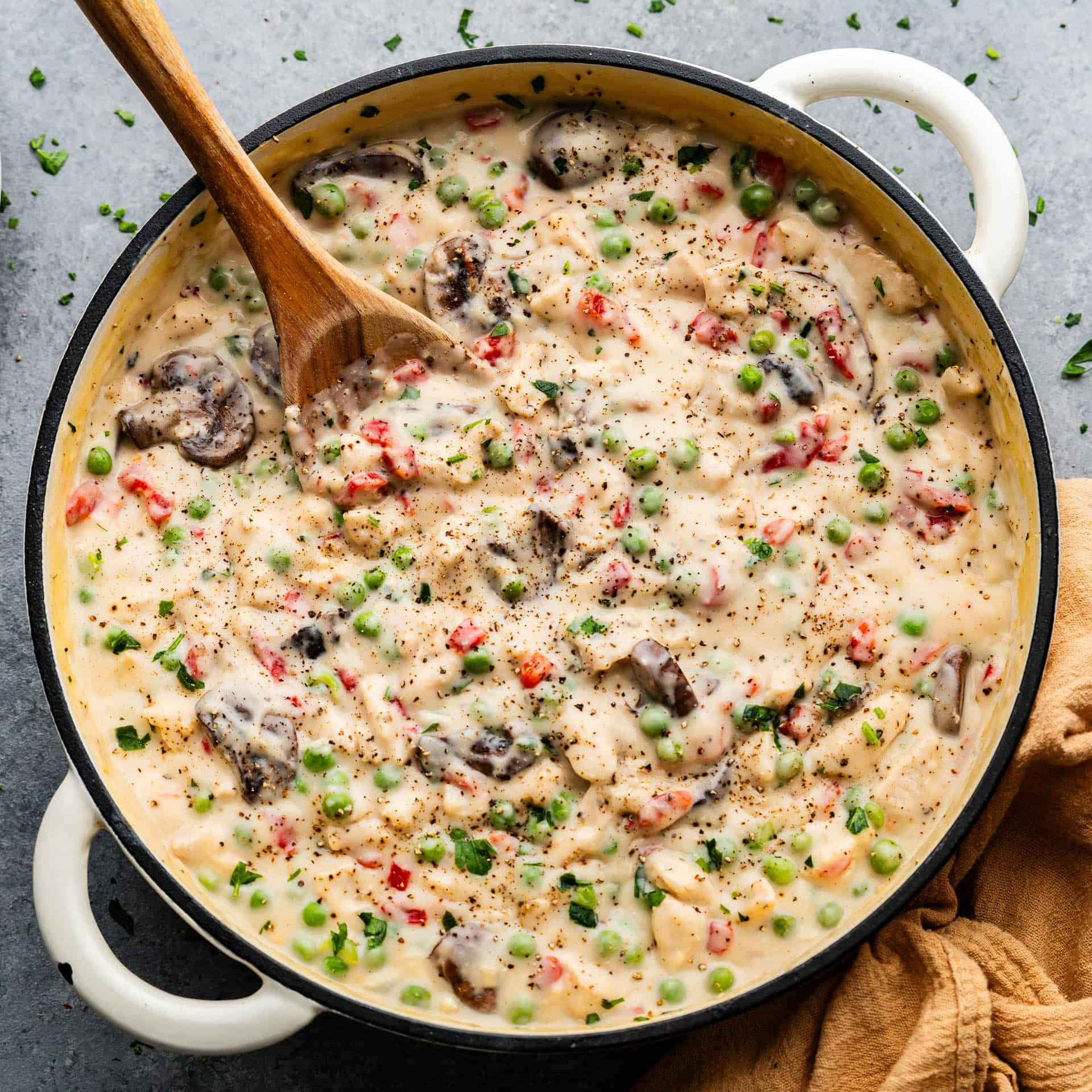 Stir in 1 cup frozen peas, 1 cup diced pimientos, and 4 cups cooked chickenContinue cooking for 2-3 minutes, or until the peas are heated through and the chicken is warmed. Season with salt and pepper if desired.