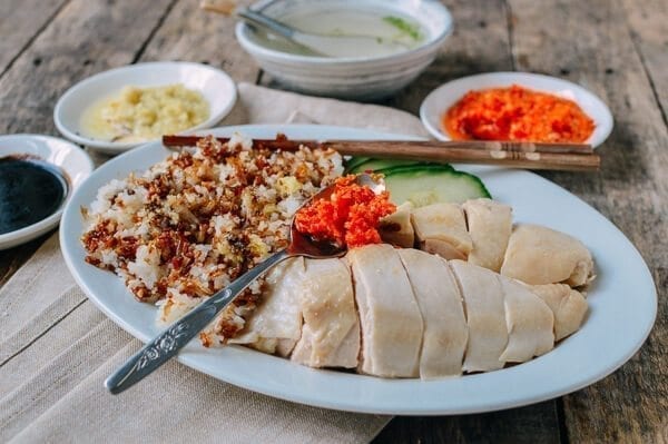 While the rice is cooking, let’s prepare the three signature dipping sauces. You can also start preparing these sauces while the chicken is cooking in the pot.