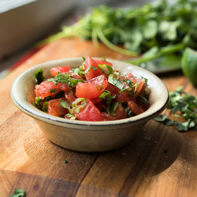 Combine all ingredients but cilantro, and taste. Add more salt, pepper or chilies if desired. Stir in half the cilantro, and set aside for 30 to 60 minutes. Adjust seasoning, garnish with remaining cilantro, and serve.